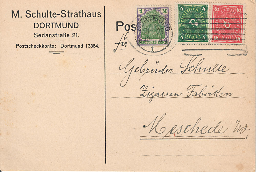 Ein erst mal recht unauffälliges Belegstück dachte ich, als ich es zum ersten Mal anschaute. Der Beleg stammt aus unserer Rundsendung der ArGe Germania, womit bewiesen wird, dass sich dort auch interessante Stücke für geringes Geld finden lassen. Der Beleg war in einer der vielen Belegetaschen und war mit einem Euro ausgezeichnet. Dann blieb das Stück erst mal ein paar Monate liegen, bis es bei mir in die Sammlung eingeordnet werden sollte. Jetzt erst fiel mir der Maschinenhalbstempel von DORTMUND 1 mit dem Verwendungsdatum 10.1.23 auf!