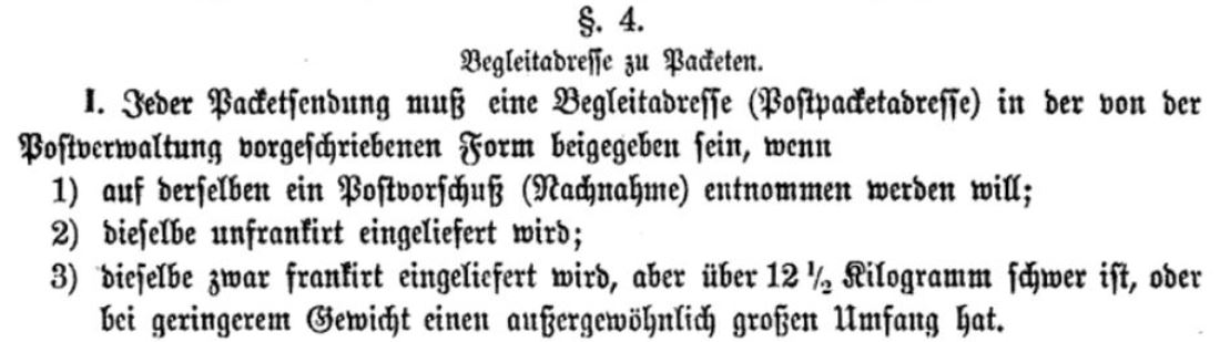 Das bedeutet aber, dass Paketsendungen unter 12½ kg keiner Begleitadresse (Postpacketadresse, Paketkarte) bedurften. Das Publikum konnte so Koffer, Körbe etc. mit einem solchen Anhängern verschicken.